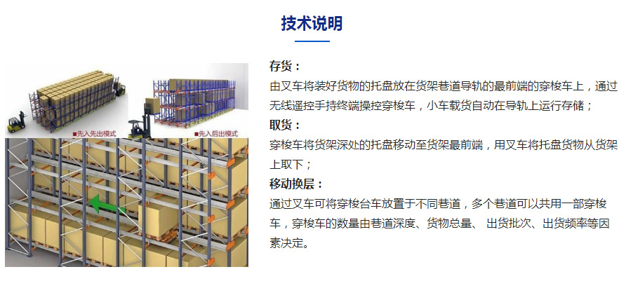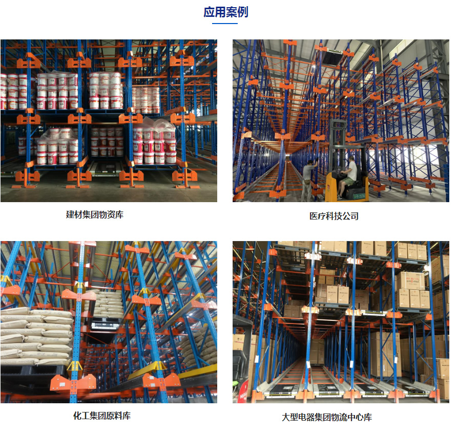 穿梭车货架系统是由货架、穿梭车以及叉车组成的高密度储存系统,仓库利用率高,工作效率高,大大减少作业等待时间,货物的存取方式可以先进先出,也可以先进后出。与贯通式货架相比,无需叉车驶入,减少货架碰撞,安全性好。该系统适用于食品、饮品、化工、烟草等单品种、批量大,品项相对单一的行业。